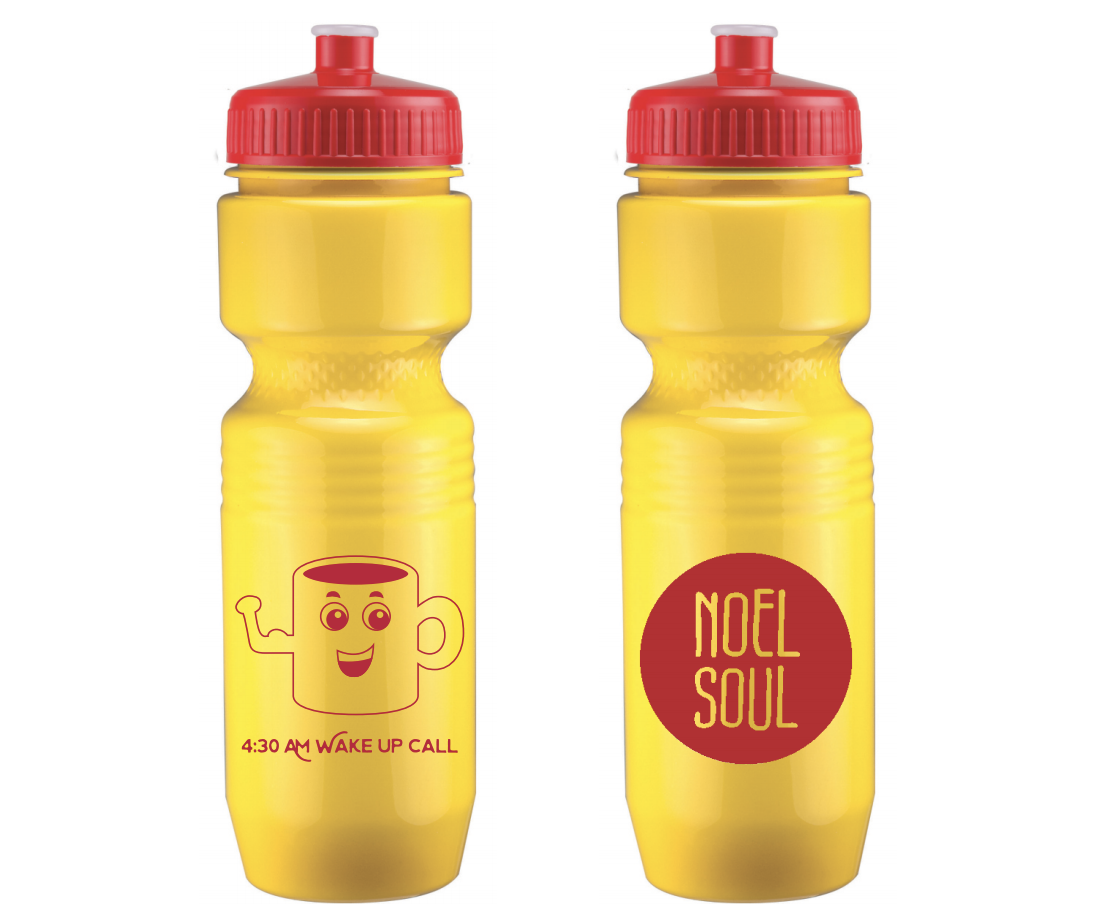 26oz jogger BPA free water bottles. Easily add ice cubes with wide mouth design. Featuring the iconic 4:30 AM wake up call mantra and a cartoon coffee mug drawn by Noel's twin Nat.